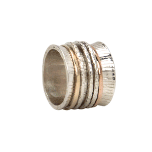 Sterling Silver Meditation Ring featuring a ribbed pattern on the base and a combination of Yellow, Rose & Silver spinning bands. Includes complimentary MeditationRings Tin & Travel Pouch