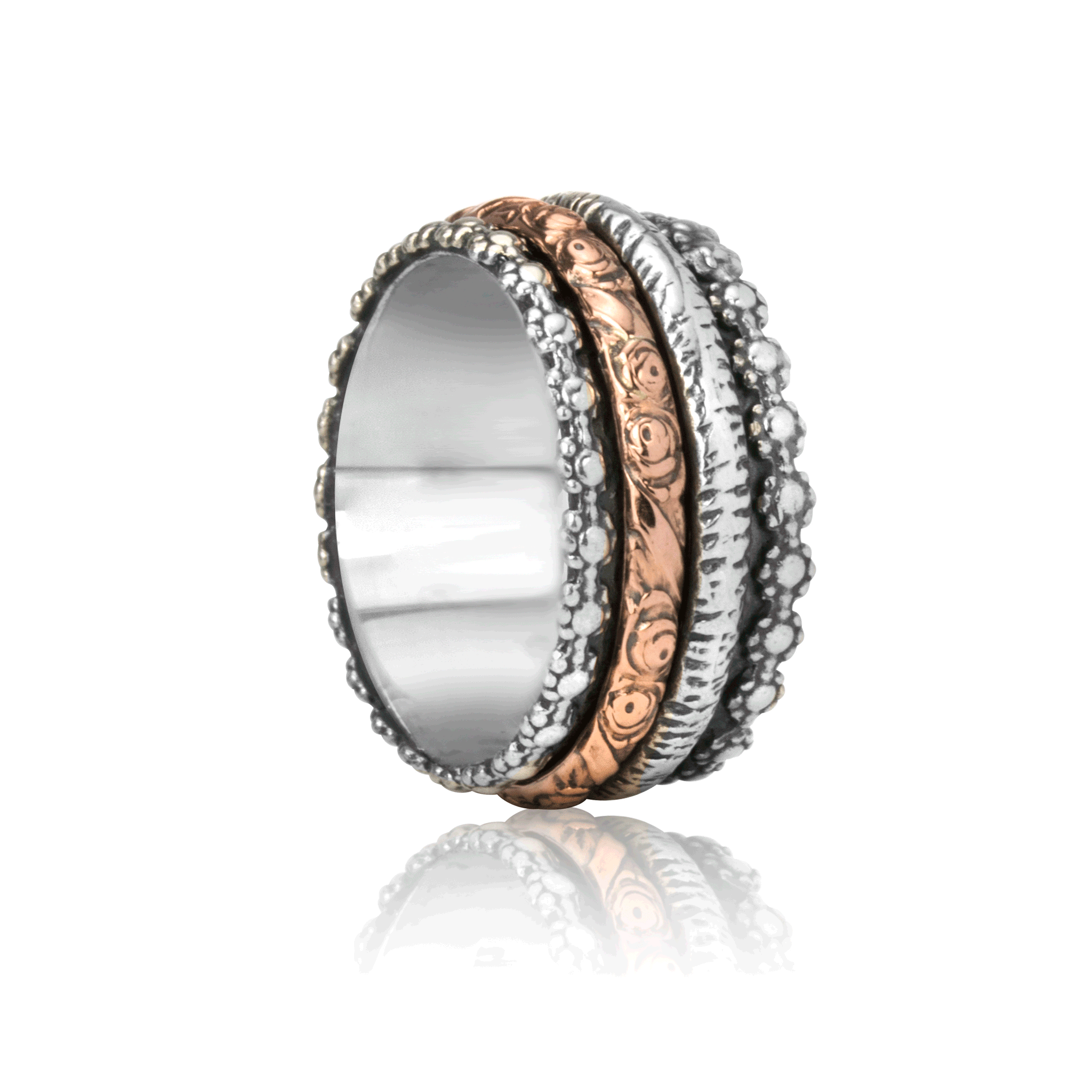Sterling Silver Meditation Ring with oxidized base and flower pattern edges featuring two spinning bands, one Rose Gold Filigree pattern and one Silver hand scraped band. Includes complimentary MeditationRings Tin & Travel Pouch